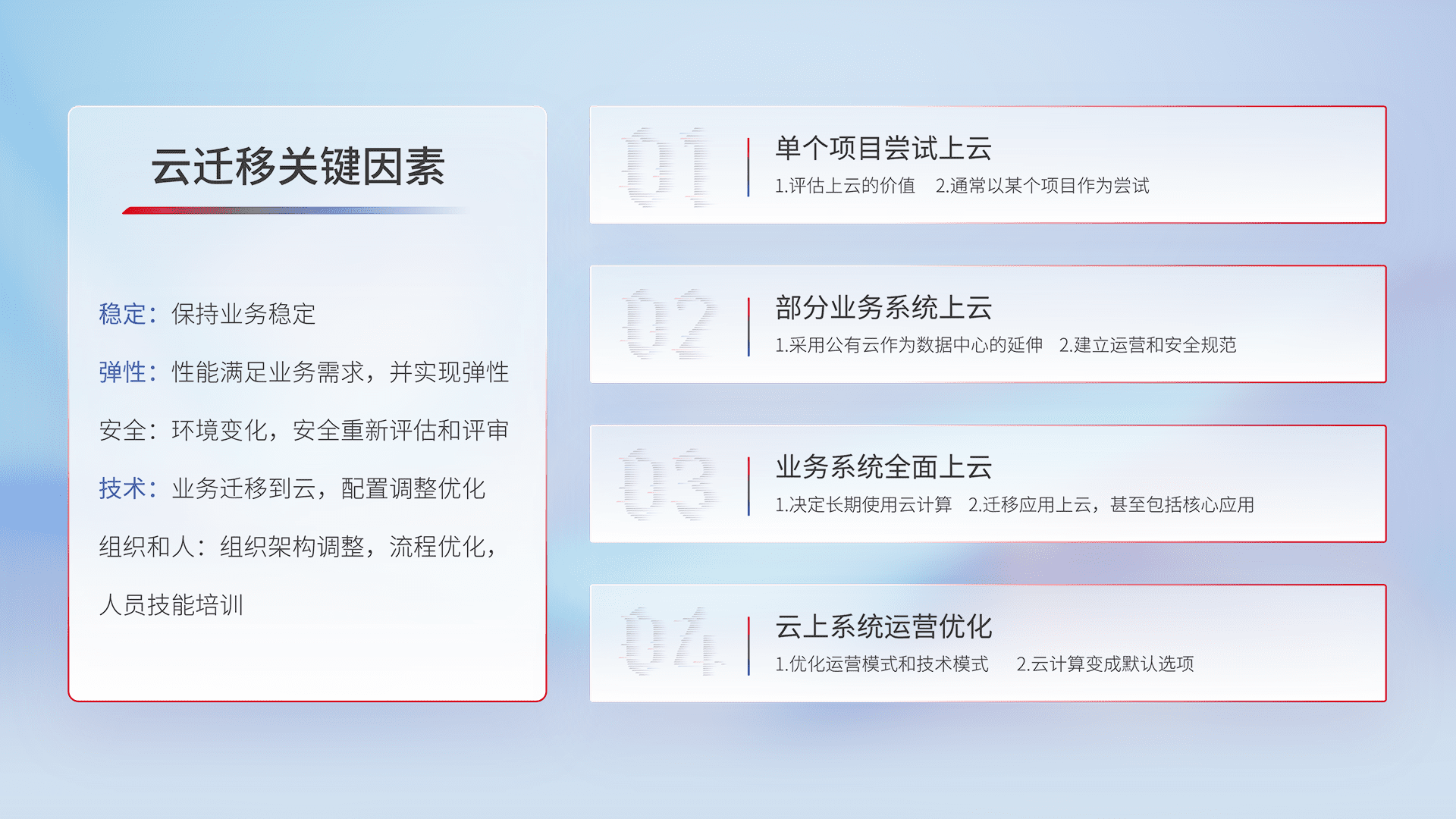 结合实际业务,,,,从规划设计、、、云平台选型、、云原生改造、、、、数据迁移、、、集成交付,,,,迁移全过程为客户识别最佳上云路径,,做好风险识别管理,,设计网络架构、、、身份权限、、、安全审计合规、、、操作审计、、、日志审计、、、监控告警策略、、、、多站点容灾设计等,,对云上基础设施进行整体规划,,,提升IT治理水平,,以满足弹性、、高可用、、、、高性能的需求。。